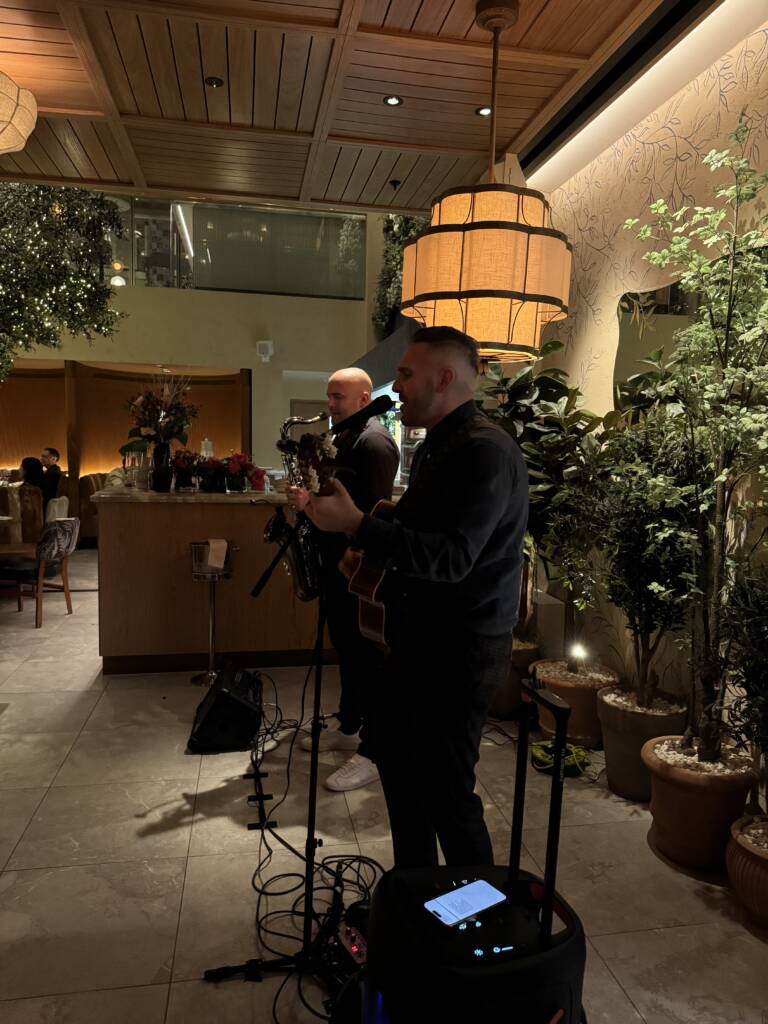 The day began with a sophisticated drinks reception in an elegant setting, featuring a guitarist/singer performing live alongside canapés and an extensive cocktail menu, creating a festive ambiance. A Gatsby-themed photo booth became a highlight, delighting guests throughout the event.