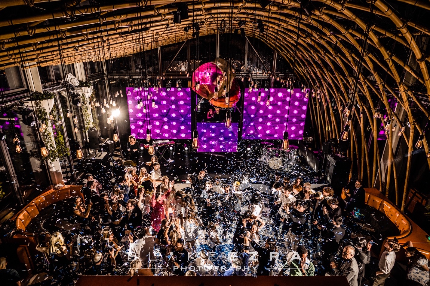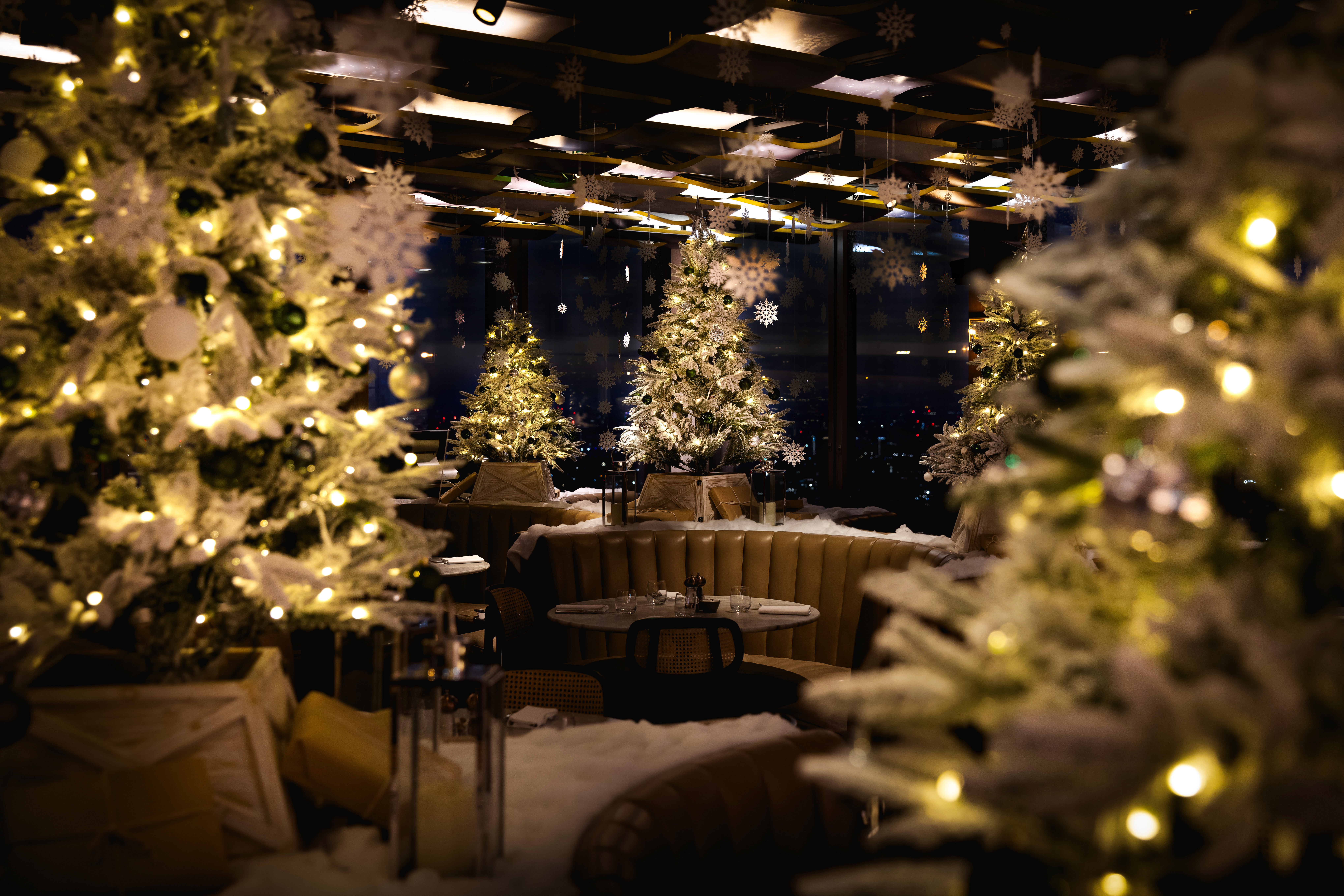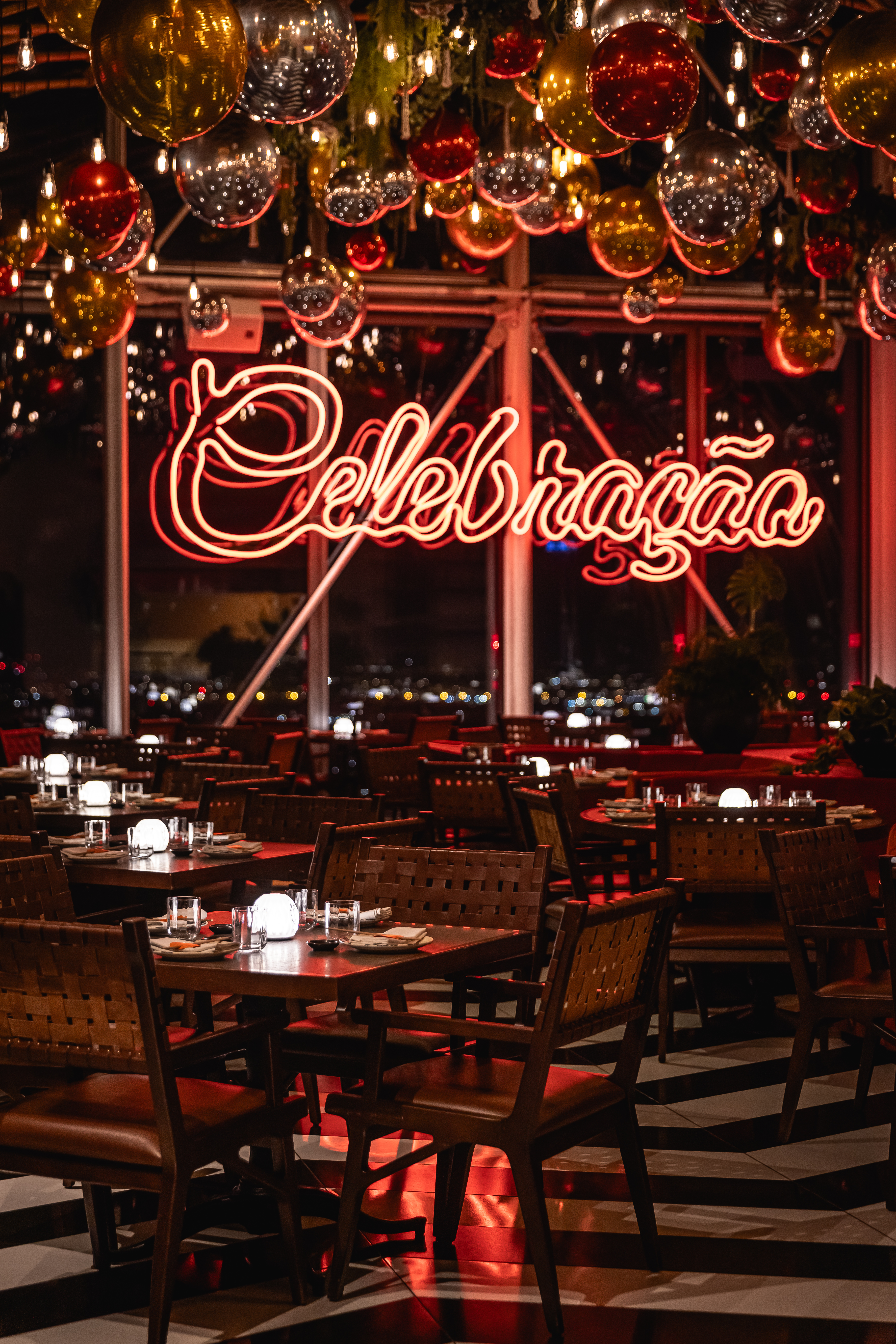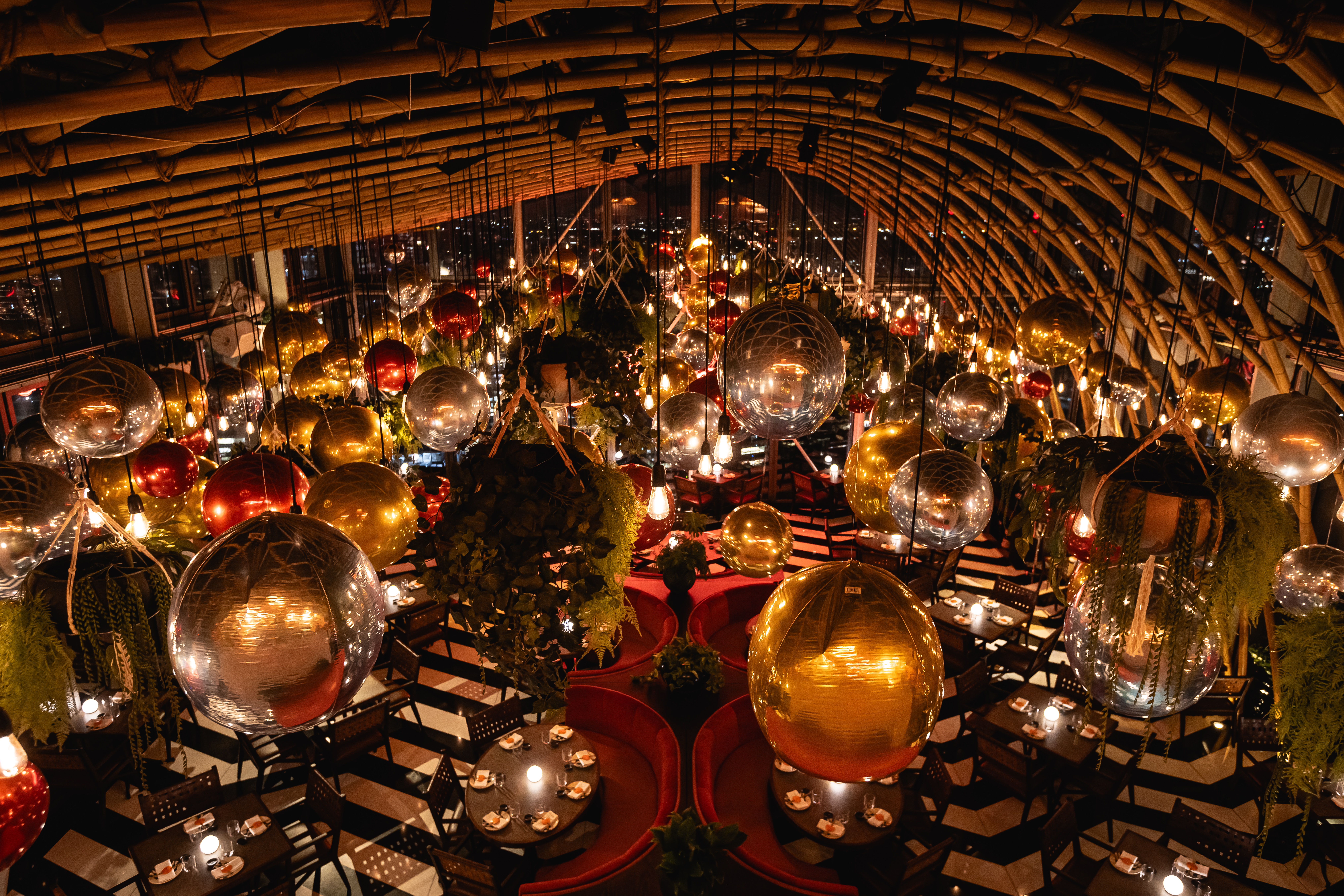 The main dining room boasts floor to ceiling windows overlooking the entire city. A grid of lights hangs suspended through the open bamboo ceiling. This fashions a vibrant atmosphere during the day. It turns into a more intimate setting in the evening.