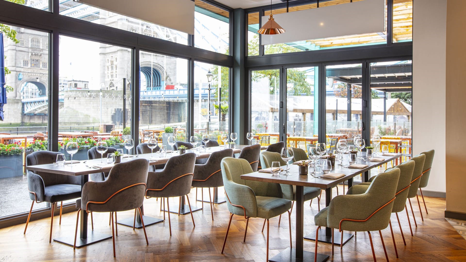 Vicinity offers three distinct spaces ideal for any event at any time of year. The Lawn offers a fantastic space to soak up the summer sun, right by the River Thames. The Terrace provides an ideal location for a drink’s reception or similar gathering – especially during summer – with spectacular views worth raving about. Indoors you will a stylish space with dining area and a large bar – brilliant for Christmas parties or a reliable wet-weather option for summer. After all, you can never quite trust the London weather!