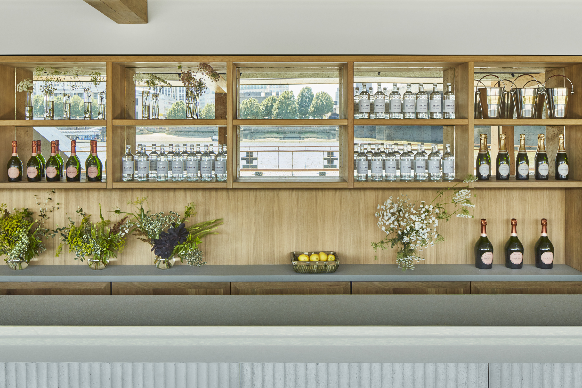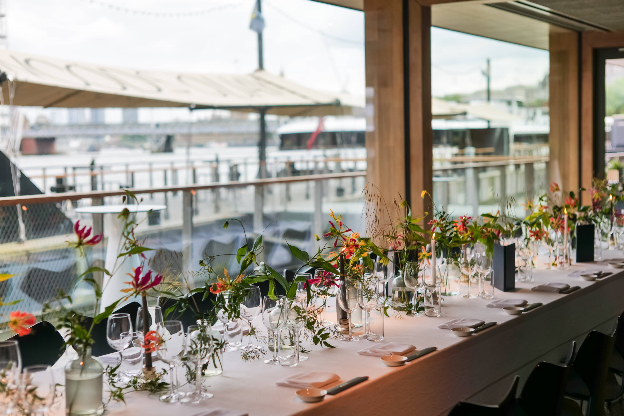 The design is a harmonious blend of natural materials – pebble terrazzo floors, a nod towards the river’s shingle banks, combined with warm touches of brass, steel, canvas, and oak. This event venue offers a variety of spaces including a spacious, light-filled reception area with panoramic views of the Southbank and Westminster, a dining room with incredible river views and an open kitchen where guests can watch chefs in action, as well as an intimate bar area serving curated cocktails, wines, and spirits.